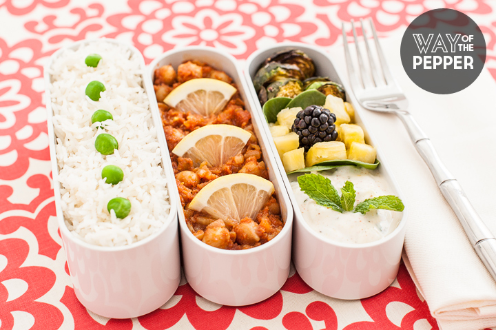 I almost didn’t have enough chana masala to fill both bentos this morning. It’s really amazing how fast those leftovers disappear. (This is mainly my fault, since the guys know that most leftovers are off-limits on account of being future bento components. Oops.)